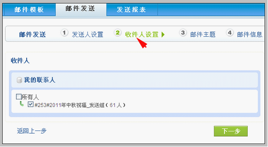 填写好之后,点击“下一步”按钮进入收件人设置步骤。 收件人设置 进入收件人设置步骤后,界面如下: