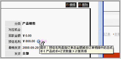 在订单详细信息中,看到预估毛利字段。虽然该订单的回款金额为0(新订单,还没有回款),但已经可以计算出该订单的预估毛利为800元。