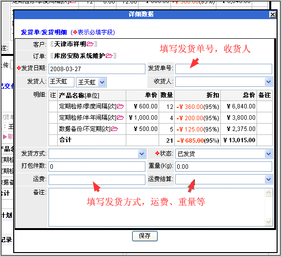 自动创建发货单,需填写单号、收货人等,保存
