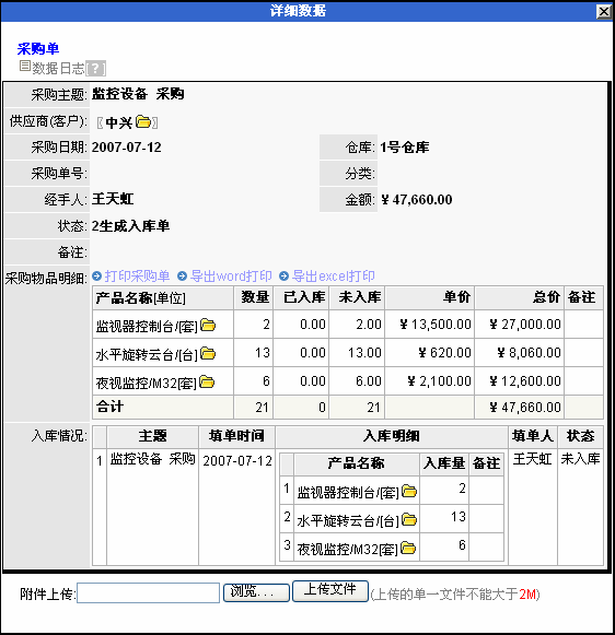 在采购单列表中,点击采购主题,进入采购详细信息,可查看该采购单的详细入库情况。例图如下: