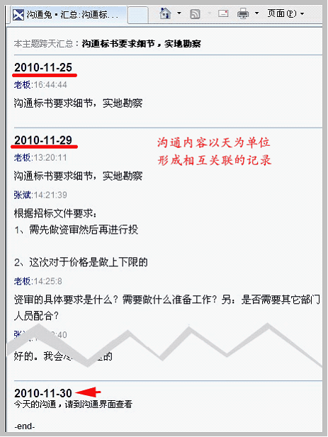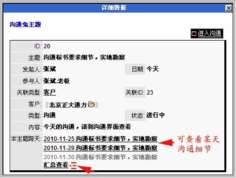 对于发生过跨天沟通的主题,沟通内容是以天为单位形成互相关联的记录,可以在其中某一天的沟通详细数据中点击界面下侧的按钮“汇总查看”,如下图: