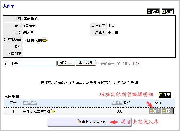 采购单的新建和编辑请参考: 这里重点说明库管确认入库的过程。