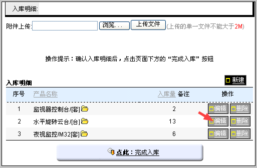 如果实际收到货物比入库单数量少,怎么处理? 采购入库的的入库单是根据采购明细生成的。 但是在实际过程中,库管收到的货品数量可能会和采购明细单有差异,可能是因为分批发货或者发货中的丢失,或者发货方少发等。 库管需要如实记录入库数量,没有收到的货品需让采购人员准确知道。 具体操作: 在“编辑明细,确认入库”的过程中,根据实际到货数量修改入库明细,保存后再入库。 比如:水平旋转云台原定到货13台,实际到货10。在该入库单中,入库明细中点击该产品后面的“编辑”按钮。如下图: 点击编辑后,修改入库量为10,并保存。 保存后,点击完成入库即可。