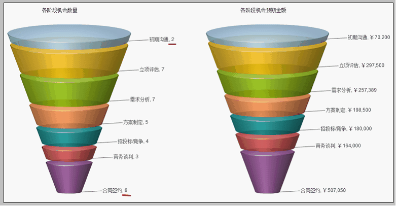 销售漏斗的查看 从菜单进入销售机会列表,可看到销售漏斗如下图所示: