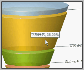 左侧漏斗是根据销售机会数量计算各阶段占比分布的。 右侧漏斗是根据销售机会的预期金额计算各阶段占比分布的。 查看各阶段的百分比 把鼠标移动到各个漏斗的各个阶段,即可看到各阶段所占百分比。 另外,百分比和漏斗各阶段的高度有关系,高度越高表明所占百分比越大。 如下图: