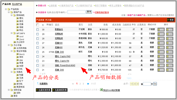 下图为:产品管理的界面,左侧是设置好的产品分类,右侧是已经录入或者导入的产品明细