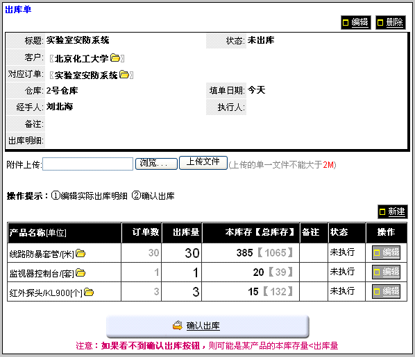 从上图可看出,整个过程需要库管人员擦操作的就是“确认出库单”这个步骤。 而这个过程的其他环节请参考:先出库再发货(与仓库有关) 下面我们具体讲解“仓库管理人员确认出库单出库”的过程: 1.仓库管理人员进入出库单列表,看到操作区域有出库按钮的出库单如下所示: 2.点击“出库”,进入出库单详细界面,根据出库明细出库,并点击“确认出库”按钮,如下图: 3.点击后,看到出库完成的提示 4.点击确定结束出库。