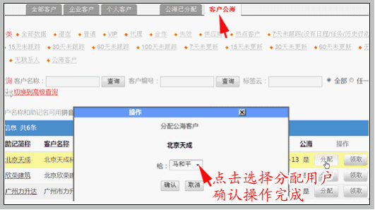 在“客户公海”中找到客户“北京天成”,点击“分配”按钮后,选择人员,确认完成。