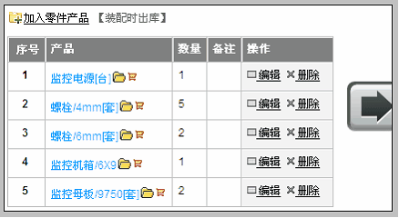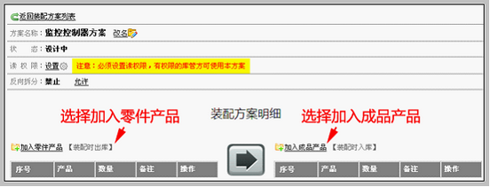 注意:在这个界面里,要进行的操作包括: 1)选择加入零件产品和成品产品 2)设置读权限 3)设置是否允许反向拆分 下面我们逐步讲解。 选择加入零件产品和成品产品 重要提示:这一步要做的是,告诉系统每装配一套成品需要几种几个零件。 以前面我们举得例子:1台电源+5套4mm螺栓+2套6mm螺栓+1套机箱+2套母板=1台监控控制器 点击“加入零件产品”
