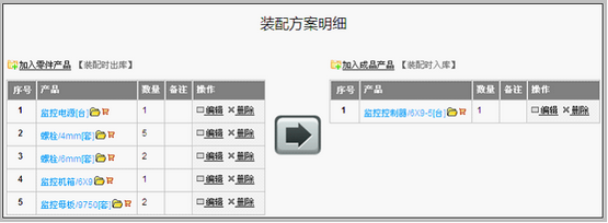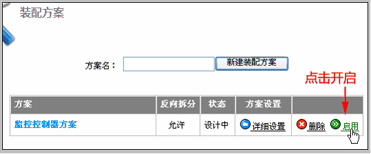 选择反向拆分方案时,将实现成品出库,零件入库的操作。 启用装配方案 装配方案设置完成后,需“启用”。 方法:返回装配单方案列表,点击“启用”,如下图: