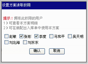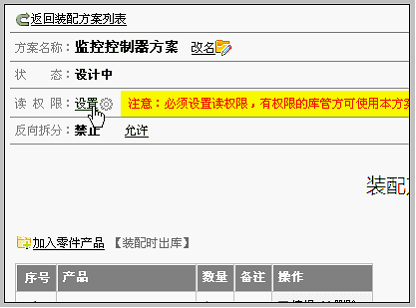 注意这个界面所显示的明细中,清晰地表明了由5种零件装配为1台成品的数量配比方案。 至此,加入零件和加入成品的操作完成。 设置读权限 明细设置后,还要设置本方案的读权限。即:赋予能使用该装配方案的库管人员“读权限”。 方法如下: