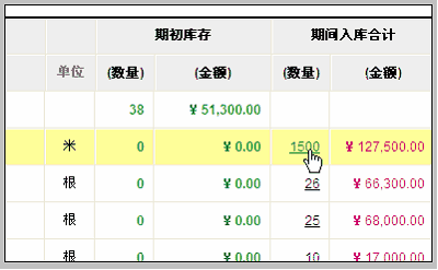 如上图所示,绿色表示期初值;红色表示入库合计,棕色表示出库合计,蓝色表示期末值。 入库合计和出库合计支持数据钻取