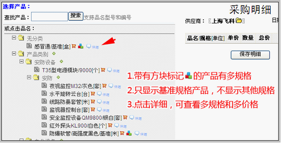 多规格产品入库:当采购入库时 采购人员负责填写采购单时如何使用多规格产品?与之前的采购明细编辑界面相比,其差别就在左侧选择产品树部分。 编辑采购单明细