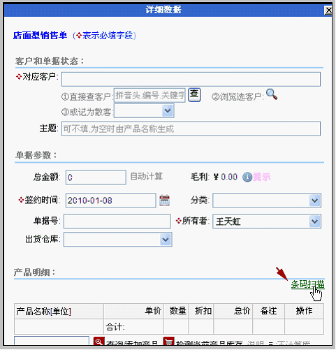 编辑店面型销售单时,使用条码扫描选择产品