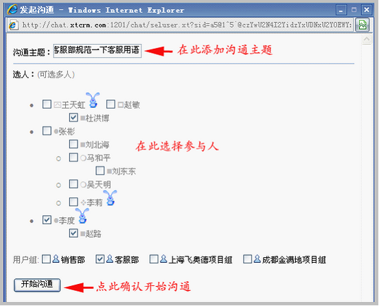 点击后,进入发起沟通界面,填写沟通主题,选择沟通参与人,点击按钮“开始沟通”。如下图: