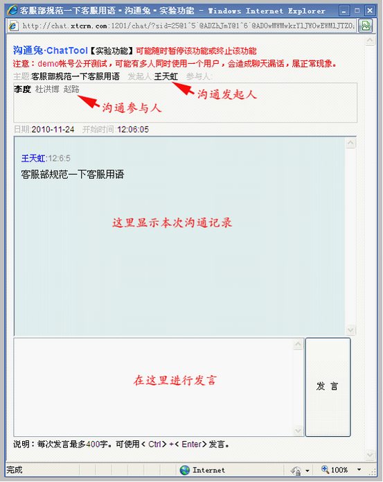 如图所示,在沟通界面,会显示沟通主题,沟通发起人,沟通参与人,发起沟通时间等。 注意: 1)当参与人在线时,在沟通界面中呈黑色显示,反之,呈灰色显示。从上图可看出,目前,李度的沟通兔/ChatTool在线,杜洪博和赵璐的沟通兔/ChatTool离线。 2)每次发言,最多可发送400字。发言时,可点击发言按钮,也可以使用<Ctrl> + <Enter>快捷键。 |