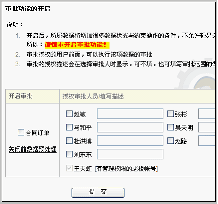 审批功能在开启之前,请确认订单的审批是必须的。因为开启审批后,如果希望关闭审批,则需要做大量的数据处理工作。具体请参见:“关闭前数据预处理”的功能。 所以,我们建议您,在开启审批前需经过分析过程,一旦确定开启审批,就不要轻易关闭了。