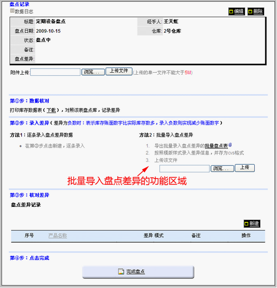 填写后保存为csv文件 填写差异,将文件保存为csv格式 上传文件 上传该文件后,可看到界面底部出现盘点明细,如下图: