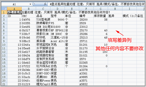 在方法2的区域,点击“批量盘点表”,下载。 填写差异 下载后在excel中打开,填写下图中红色箭头指示的列,即为差异。 填写时注意: