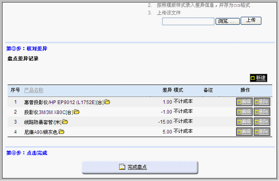 注意,完成盘点之前,仍然可以在本界面修改盘点差异。修改无误后,点击“完成盘点”。 |