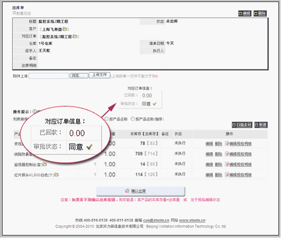 库管在进入出库单时,可看到对应订单的回款金额和审批状态(如果启用审批),库管人员可据此判断是否马上操作确认出库。如下图所示: