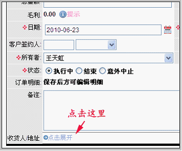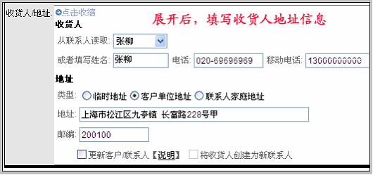 说明 有些企业是由库管人员统一发货的,这就要用到库管统一发货的功能。与销售发货不同之处在于,销售人员在为订单申请出库前,需明确客户收货人和地址,以便于发货时自动通知给库管。 操作 销售人员新建订单时 可以看到在新建订单位置底部,“收货人/地址”后面有蓝色的点击展开链接。如希望库管人员发货,需点击这里,展开填写收货人/地址内容。