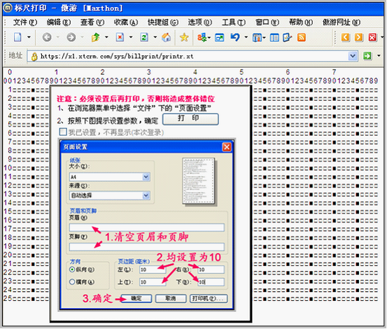 打印标尺 打印标尺的作用,是在一张空白快递单上打印出x和y方向的坐标尺。 操作方法: 1)点击打印 2)在弹出的窗口中,看到如下图所示界面: 在打印之前,必须对IE打印做好设置。包括:清空页眉和页脚内容,把页边距的上下左右改为10。 在实际应用中,可能“下”不能改为10,修改后会自动变为其他值,一般不会影响打印效果。 3)设置后,点击打印按钮。正常打印后,快递单类似下图情况: 打印标尺后,即可按照快递单上需要填写的内容区域设计快递单。