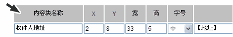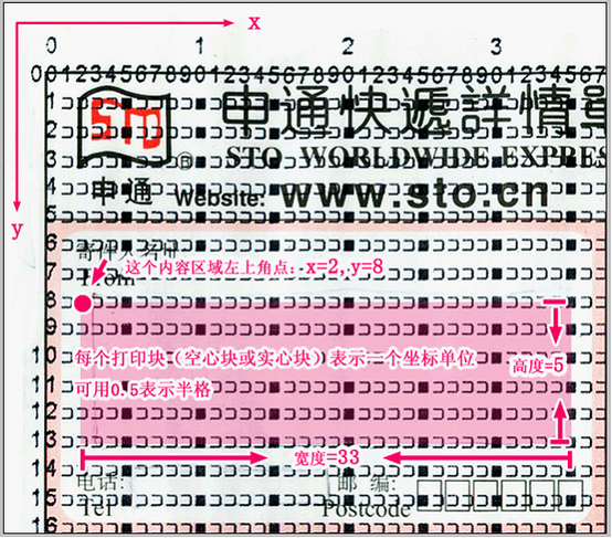 设计快递单内各个内容区域的参数 1)首先您要把快递单上需要填写的内容区域画出来,这会比较有利于您的设计。 都用矩形区域画出,例如下图申通快递单: 这几个内容区域分别是:发件人地址、发件人电话,收件人地址、收件人电话。 2)根据坐标尺,确定每个内容区域的左上角坐标(x,y),宽度和高度 具体的设置方法如下: 根据上图我们可以知道: 每个打印的空心小方块或者实心小方块均表示一个坐标单位1 您可以使用0.5表示半个单位 水平方向是x坐标,垂直方向是y坐标