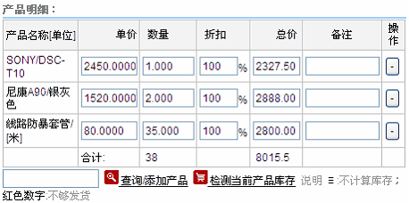 4.产品明细 查询并选择产品,输入数量,自动计算总价。