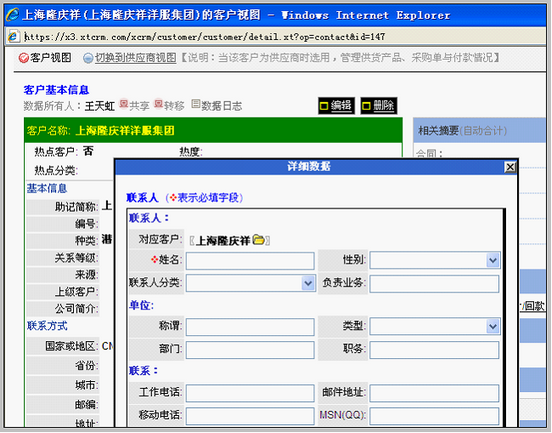 如果点击保存并新建联系人按钮,则直接打开该客户视图后,出现新建联系人的区域,如下图所示:
