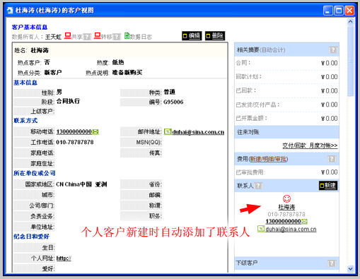 在客户视图内看到:个人客户新建时自动新建了联系人