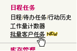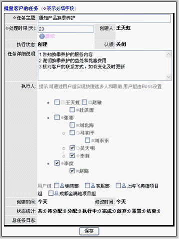 注意:处理时限,该任务中的某客户被分配或被领用后开始计时,如果该客户的此批量任务逾期未完成,则被自动重置,也就是说从当前执行人处收回,等待重新分配换人处理。如果该任务并不需要设置时限,可输入0。执行人,一般选择多个人,也就是说这些客户的事务交给哪些人执行。 点击保存。 进入批量客户任务视图,加入客户 点击新建立的批量任务主题,进入视图,如下: