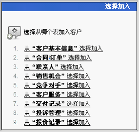 可以看到:批量任务的操作分为两步:1.加入客户 2.任务分配。下面我们分别讲述: 点击选择加入图标