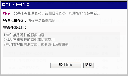 注意:加入全部页客户常用于某类客户,比如:全部的正式客户,全部的30天未跟踪的客户等。 以本页选中的客户为例,比如我们选中了8个客户,点击“加入到批量任务”。点击后看到提示如下: