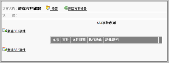 在SFA序列中,各事件的名称、执行日期、执行动作、动作说明等,在右侧出现四种动作分别是:编辑、删除、上移和下移。上移和下移用于调整事件在方案的中的现实顺序。