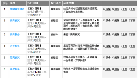 举个例子:比如作婴儿用品的企业,要根据婴儿的出生日期作为基准,从而判断满月、半天、半岁、周岁等销售阶段的不同跟进方式。如下面的满月服务的时间设置: