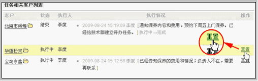 重置一个客户任务 当批量任务内某客户需要变更执行人或重新分配时,需要先“重置”。重置的操作实际上执行的是清空当前执行人,然后可以再分配。操作方法是:点击客户任务右侧的操作区域“重置”,如下图: