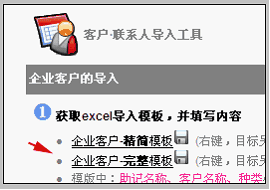 说明 客户和联系人的导入,在原有模板基础上,增加了支持几乎全字段的完整模板,可支持更多原始客户信息的导入应用。 操作 点击进入菜单中的客户-客户导入 可看到精简模板和完整模板两种。如下图: