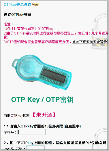 根据界面上的提示,设置OTPkey需要几个步骤: 第一步:输入OTPkey背面的条码数字,13位。 第二步:按OTP上显示按钮,输入动态密码。 第三步:等待OTP上的密码消失,再次按显示按钮,直至出现与第一个不同的动态密码,输入。 第四步:设置一个OTPkey登录时使用的密码。 经过这四步操作,OTPkey即可绑定成功。 使用OTPkey登录的方法 与USBkey不同,OTPkey既可以在安全登录客户端使用,也可以在网页登录入口使用。如下图所示: