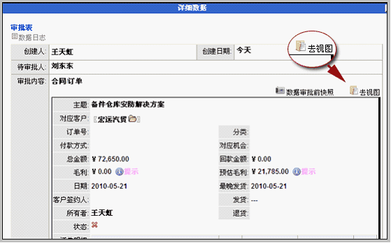 可以使用去视图功能,进入审批数据对应的合同或订单视图。
