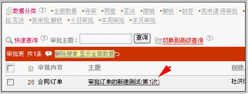 同意后,此数据在审批列表中消失。实际上是审批状态发生了变化,当前列表是有过滤条件的(今日待审批),点击“解除搜索”或者数据分类中的“全部数据”,即可看到刚审批同意的那条数据,如下图: