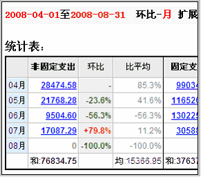 点击进入环比分析后,可以看到类似上图的界面。 第1步,选择分析数据的时间段。比如我们选择2008-04-01到2008-08-31 第2步,选择环比单位,如果选择月,则会出现4、5、6、7、8连续5个月的环比数据。 然后点击查看统计的按钮, 可以看到统计表和统计图。