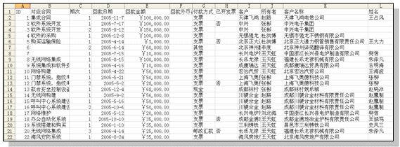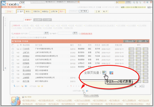 作用: 可以单独导出某个数据表,或者某个数据表的部分数据;同时,单表导出支持该表内的关联数据表的导出。比如:回款记录表中,合同名称关联合同表,客户名称关联客户表等。 单表导出支持该表的查询条件,包括:快速查询和高级查询。比如:我们可以只导出2006年12月的回款记录等。 单表导出功能需要由老板用户赋予操作权限,只有被赋予单表导出权限的用户才可以操作单表的导出功能。导出的格式是excel中可以打开的csv(逗号间隔)。
