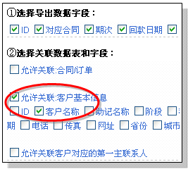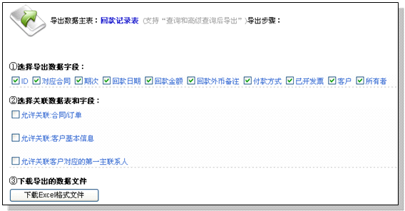 通过单表导出,可以大大增强对单表数据统计的灵活性;同时,还可以辅助生成数据汇总。 比如:某类客户的基本信息和联系人列表;比如:打印信封所需要的邮编、地址、客户单位、收件人姓名等。 操作方法: 赋予单表导出权限(老板用户) 单表导出需要老板用户授权 单表导出的操作方法 被赋予单表导出权限的用户,可以在数据表的下方看到“导出excel格式数据”的链接。如下图: 点击“导出excel格式数据”的链接,进入单表导出界面。 我们以“合同回款表”导出为例说明: 分为三个步骤:1)选择导出数据字段 2)选择关联数据表和字段 3)下载导出的文件。如下图所示: 您可以任意选择所需要导出的字段。第1)步的选择操作比较简单,只需要选择相应的字段即可。 第2)步的操作是:首先选择相应的关联表,然后选择关联表内的字段。关联表的操作作用我们来举例说明: 比如在回款记录表中,我们需要导出某项回款的客户名称,则可以在“允许关联:客户基本信息”前打勾,如下图所示: 然后在关联的客户基本信息中选择“客户名称”(打勾)。如果需要同时导出该客户的联系人,则需要在“允许关联客户队赢得第一主联系人”前打勾,并选择人员姓名,如下图: 选择完毕后,点击“下载excel格式文件”按钮,获取下载的文件。在excel中打开,如下图: 可以看到:客户名称和姓名字段也同时被导出了。 客户导出时选择导出对应联系人 说明 使用“导出到excel格式数据”功能导出客户数据时,可选择导出一个相应联系人,也可以选择导出全部相应联系人。 操作 在客户列表下方,点击导出到excel格式数据