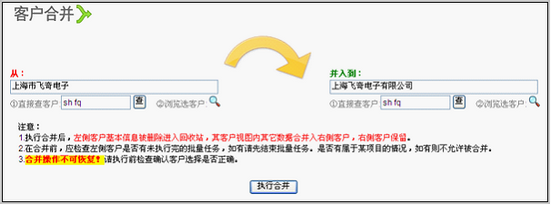 从左侧的客户合并入右侧客户。分别选择左侧客户和右侧客户,确认无误后,点击执行合并按钮。
