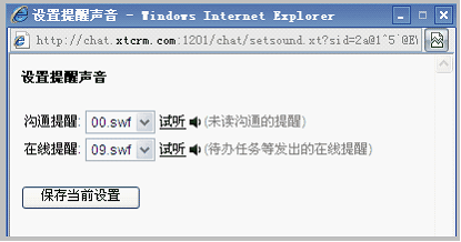 选择沟通提醒或者在线提醒中6种提示音中任意一种,也可以选择无声,并且提醒声音支持试听。点击保存当前设置,此设置在下次沟通兔/ChatTool上线时生效。
