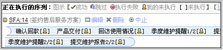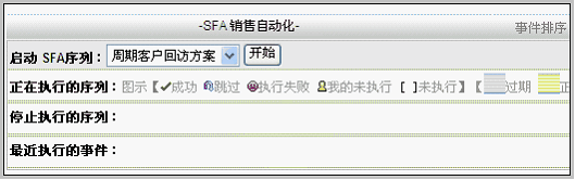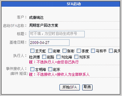 给某客户启动一个SFA序列 在客户视图中,启动SFA。 进入某客户视图,可以看到在客户基本信息下方出的SFA部分模块,如下图: 启动的方法是,选择正确的方案,点击开始按钮。之后,会看到启动SFA序列的对话框,如下图: 在这个界面里,我们需要确定几个元素: 2)基准日期,根据该客户情况选择基准日期,这主要看SFA方案设置时对基准日期的定义 3)执行人可以不选,如果不选执行人,则表示由您自己来执行 4)事件接收人也可以不选,自动为该客户的全部联系人,该选项主要指发邮件和发短信的接收人 您可以看到,这个界面中有很多自动处理,可以明显提升操作效率。如果不选基准日期,甚至可以直接点击开始SFA按钮。当然,SFA序列的启动也是很重要的,建议您在启动前,把这些项目认真选择后,再启动则较为稳妥。 启动后,可以看到一个SFA序列。如下图: