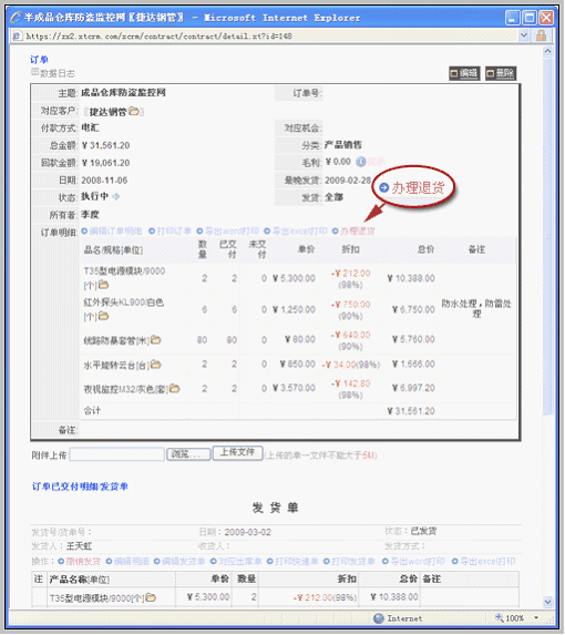 注意填写清楚应退款金额和退货后产品入库的仓库。其中:应退款金额在实际应用中应该是和客户事先沟通好的。填写后保存。保存后,即可在订单视图内,看到红色退货单。如下图所示: