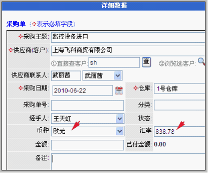 与订单类似,新建采购单时即确定所用外币币种和汇率。