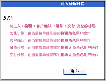 如图可知,方式3是完整维修过程,包含了检测、客户确认、维修和交付,所涉及的角色也最全,包括:接单人员、检测人员、维修人员。 点击继续,看到提示如下: